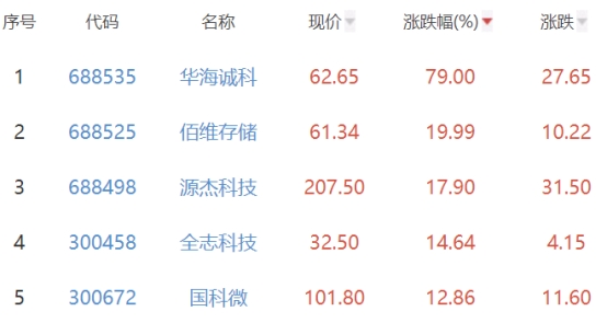 其中,华海诚科、佰维存储、源杰科技、全志科技、国科微位列板块涨幅前五位,涨幅分别为79.00%、19.99%、17.90%、14.64%、12.86%。
