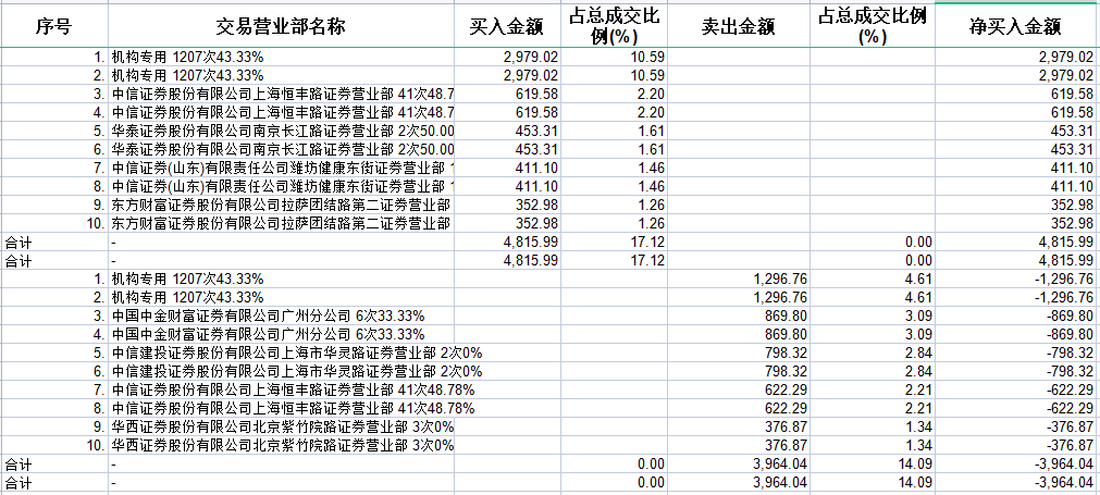 具体来看,机构买入2979.02万元,卖出1296.76万元,合计净买入1682.25万元。此外,中国中金财富证券有限公司广州分公司、中信建投证券上海市华灵路证券营业部分别卖出869.80万元、798.32万元;中信证券上海恒丰路证券营业部、华泰证券南京长江路证券营业部分别买入619.58万元、453.31万元。