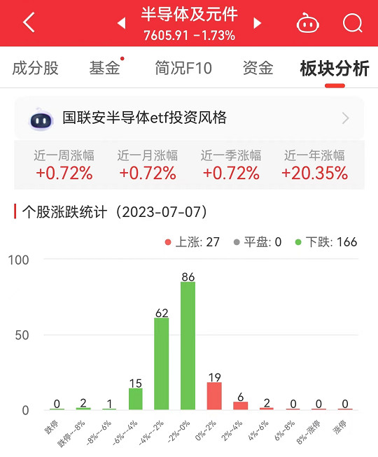 中国经济网北京7月7日讯 今日,半导体及元件板块整体跌幅1.73%,其中,27只股票上涨,166只股票下跌。
