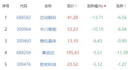 芯动联科、本川智能、惠伦晶体、寒武纪、胜宏科技位列涨幅榜后五位,涨幅分别为-13.71%、-10.19%、-6.43%、-5.51%、-5.12%。