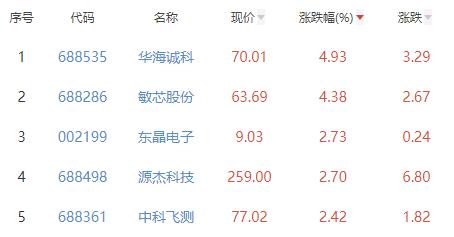 其中,华海诚科、敏芯股份、东晶电子、源杰科技、中科飞测位列板块涨幅前五位,涨幅分别为4.93%、4.38%、2.73%、2.70%、2.42%。