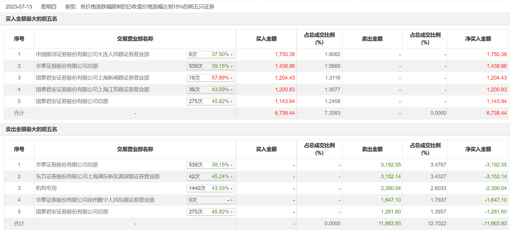 华海诚科7月13日涨停,龙虎榜数据显示,上榜营业部席位全天成交1.84亿元,占当日总成交金额比例为20.04%。其中,买入金额为6738.44万元,卖出金额为1.17亿元,合计净卖出4925.48万元。