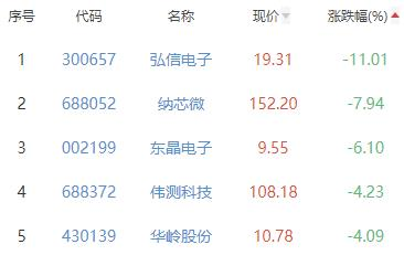 弘信电子、纳芯微、东晶电子、伟测科技、华岭股份位列涨幅榜后五位,涨幅分别为-11.01%、-7.94%、-6.10%、-4.23%、-4.09%。