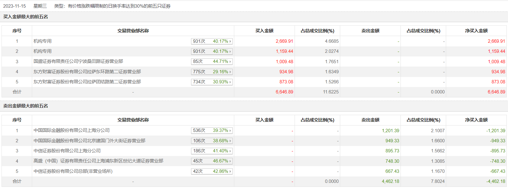 具体来看,机构合计净买入3829.35万元。此外,知名游资现身龙虎榜,宁波桑田路(国盛证券宁波桑田路证券营业部)、东方财富证券拉萨东环路第二证券营业部分别买入1009.48万元、934.98万元;中国国际金融上海分公司、中国国际金融北京建国门外大街证券营业部分别卖出1201.39万元、949.33万元。