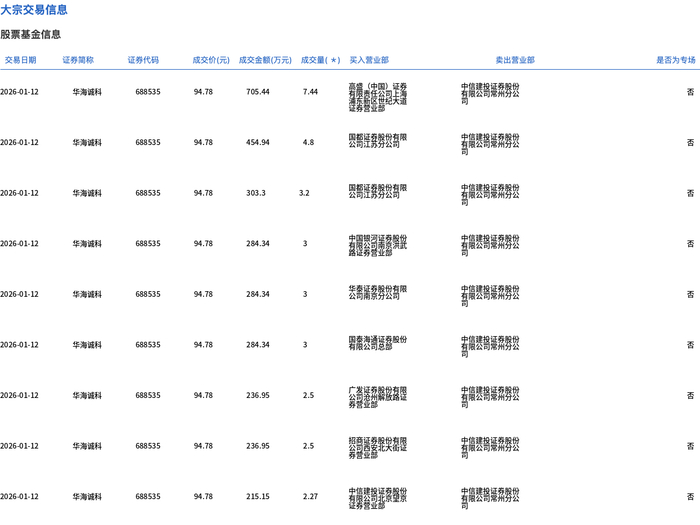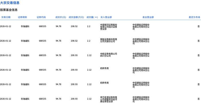 1月12日,华海诚科大宗交易成交44.59万股,成交额4226.51万元,占当日总成交额的5.76%,成交价94.78元,较市场收盘价116.06元折价18.34%。
