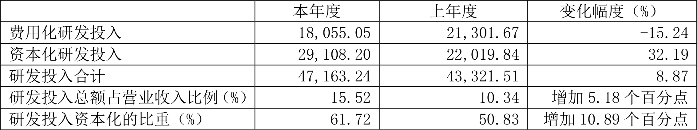 2023年全年,公司研发投入金额为4.72亿元,同比增长8.87%;研发投入占营业收入比例为15.52%,相比上年同期上升5.18个百分点。此外,公司全年研发投入资本化率为61.72%。