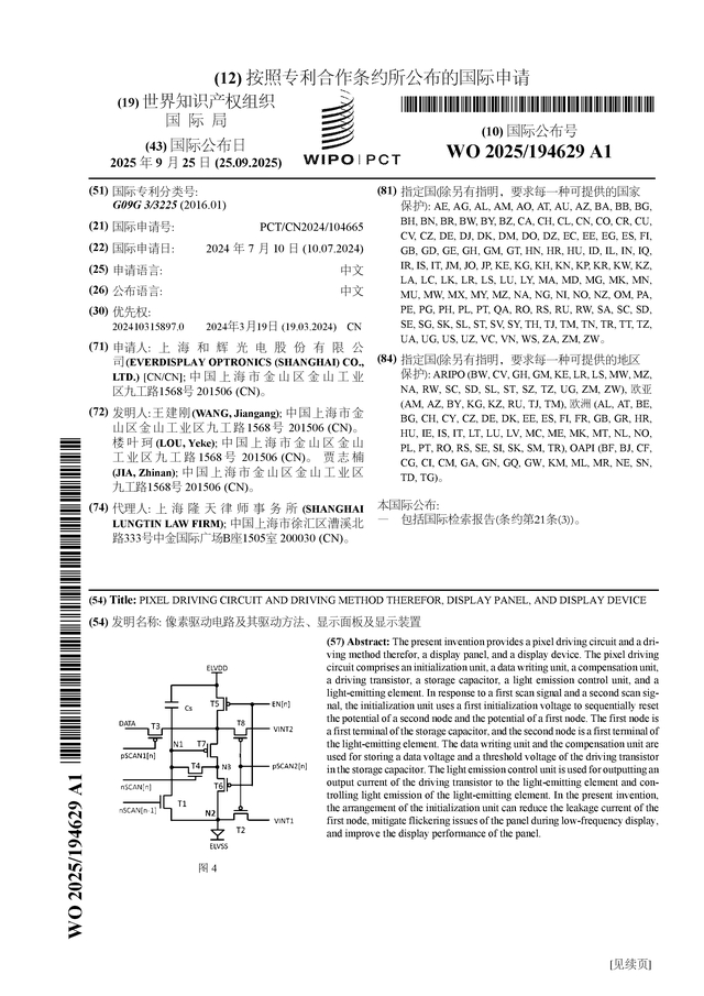 和辉光电公布国际专利申请:“像素驱动电路及其驱动方法、显示面板及显示装置”