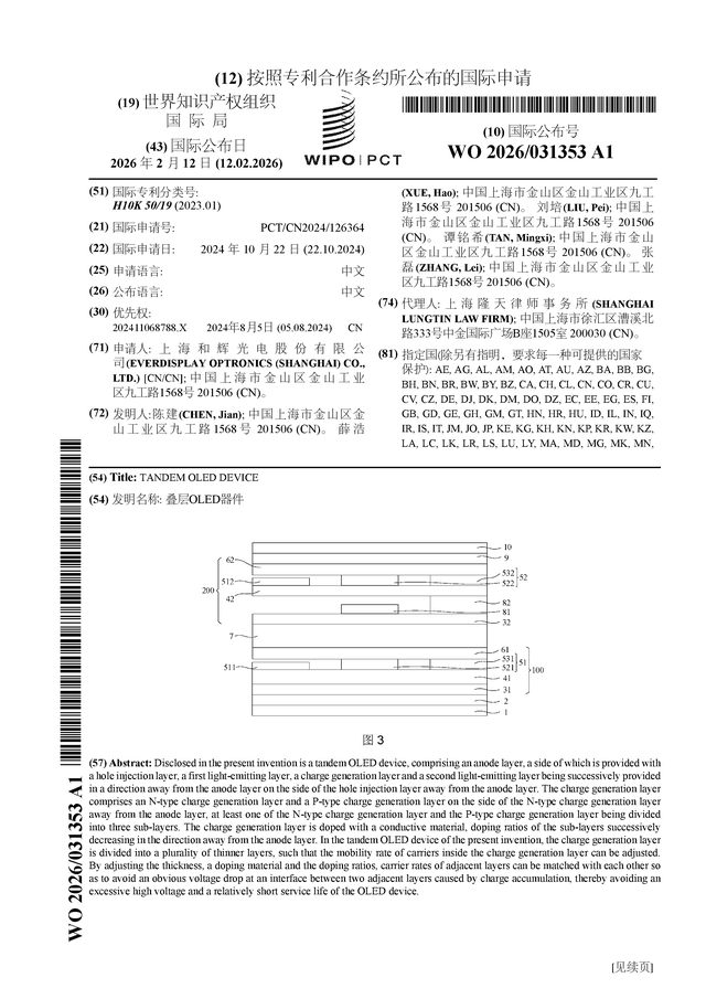 证券之星消息,根据企查查数据显示和辉光电(688538)公布了一项国际专利申请,专利名为“叠层OLED器件”,专利申请号为PCT/CN2024/126364,国际公布日为2026年2月12日。