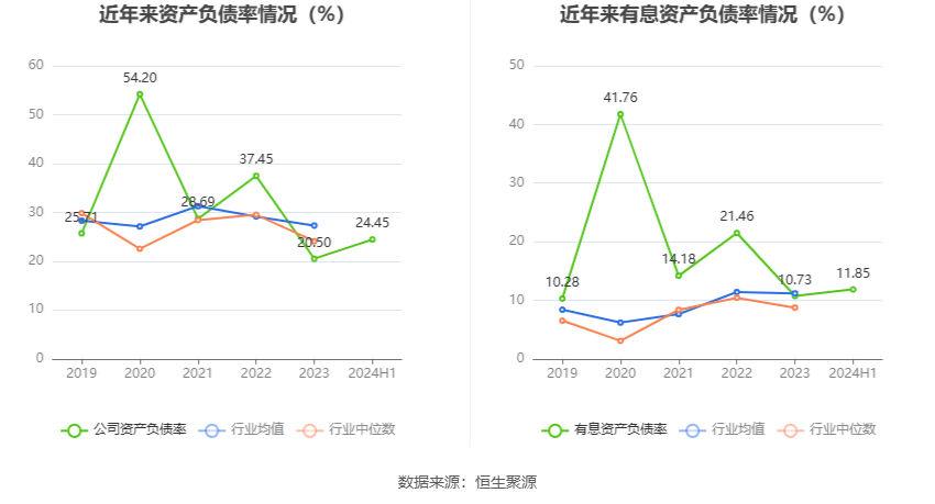 在偿债能力方面,公司2024年上半年末资产负债率为24.45%,相比上年末上升3.95个百分点;有息资产负债率为11.85%,相比上年末上升1.12个百分点。