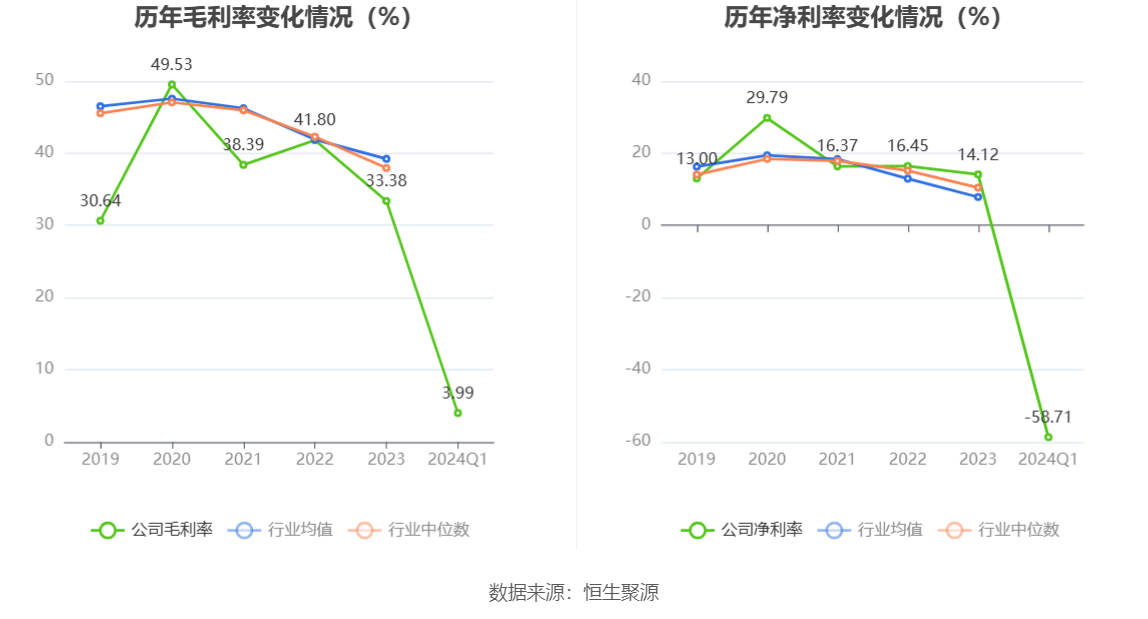 2024年第一季度,公司毛利率为3.99%,同比下降21.46个百分点;净利率为-58.71%,较上年同期下降25.16个百分点。