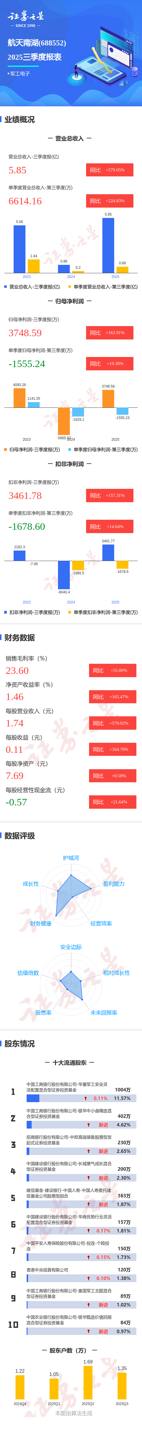 证券之星消息,航天南湖2025年三季报显示,前三季度公司主营收入5.85亿元,同比上升579.06%;归母净利润3748.59万元,同比上升163.91%;扣非净利润3461.78万元,同比上升157.31%;其中2025年第三季度,公司单季度主营收入6614.16万元,同比上升224.84%;单季度归母净利润-1555.24万元,同比上升19.38%;单季度扣非净利润-1678.6万元,同比上升14.64%;负债率18.55%,财务费用-1671.86万元,毛利率23.6%。