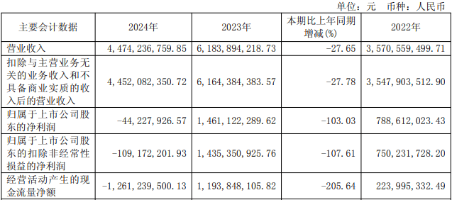 2024年,高测股份实现营业收入44.74亿元,同比减少27.65%;归属于上市公司股东的净利润-4422.79万元,同比减少103.03%;归属于上市公司股东的扣除非经常性损益的净利润-1.09亿元,同比减少107.61%;经营活动产生的现金流量净额-12.61亿元,同比减少205.64%。