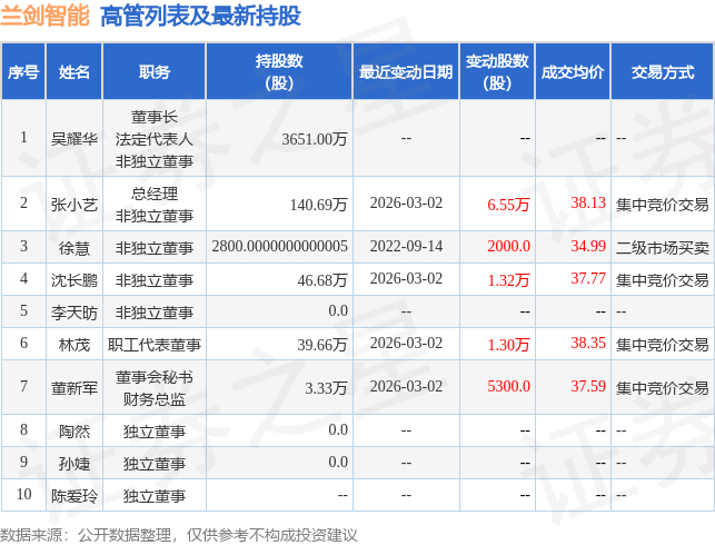 兰剑智能的高管列表及最新持股情况如下: