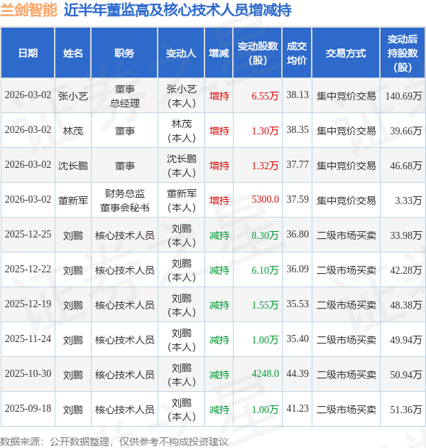 兰剑智能近半年内的董监高及核心技术人员增减持详情如下: