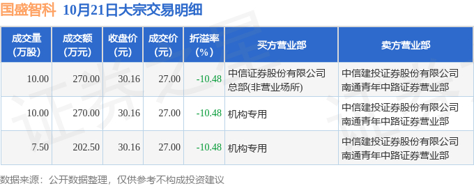 10月21日国盛智科现3笔折价10.48%的大宗交易 合计成交742.5万元