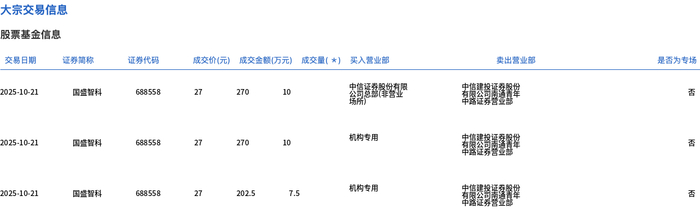 10月21日,国盛智科大宗交易成交27.5万股,成交额742.5万元,占当日总成交额的16.45%,成交价27元,较市场收盘价30.16元折价10.48%。