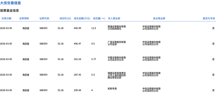 3月5日,海目星大宗交易成交36.27万股,成交额1895.47万元,占当日总成交额的3.21%,成交价52.26元,较市场收盘价56.8元折价7.99%。