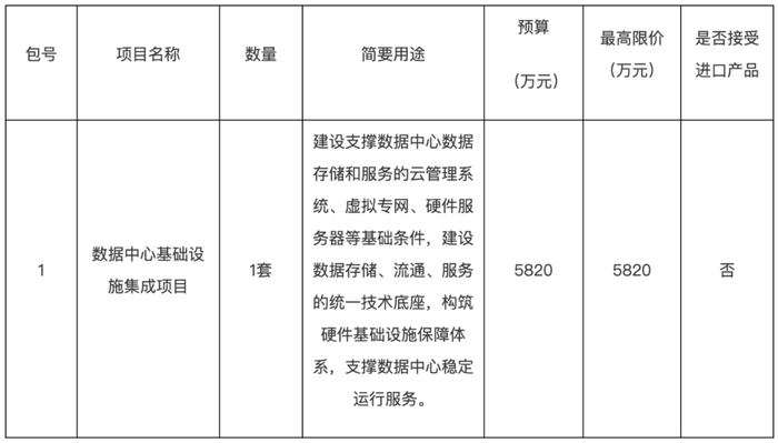2025 年 10 月 31 日,zycgr24041501 发布《数据中心基础设施集成项目》招标公告,预算 5820 万元。