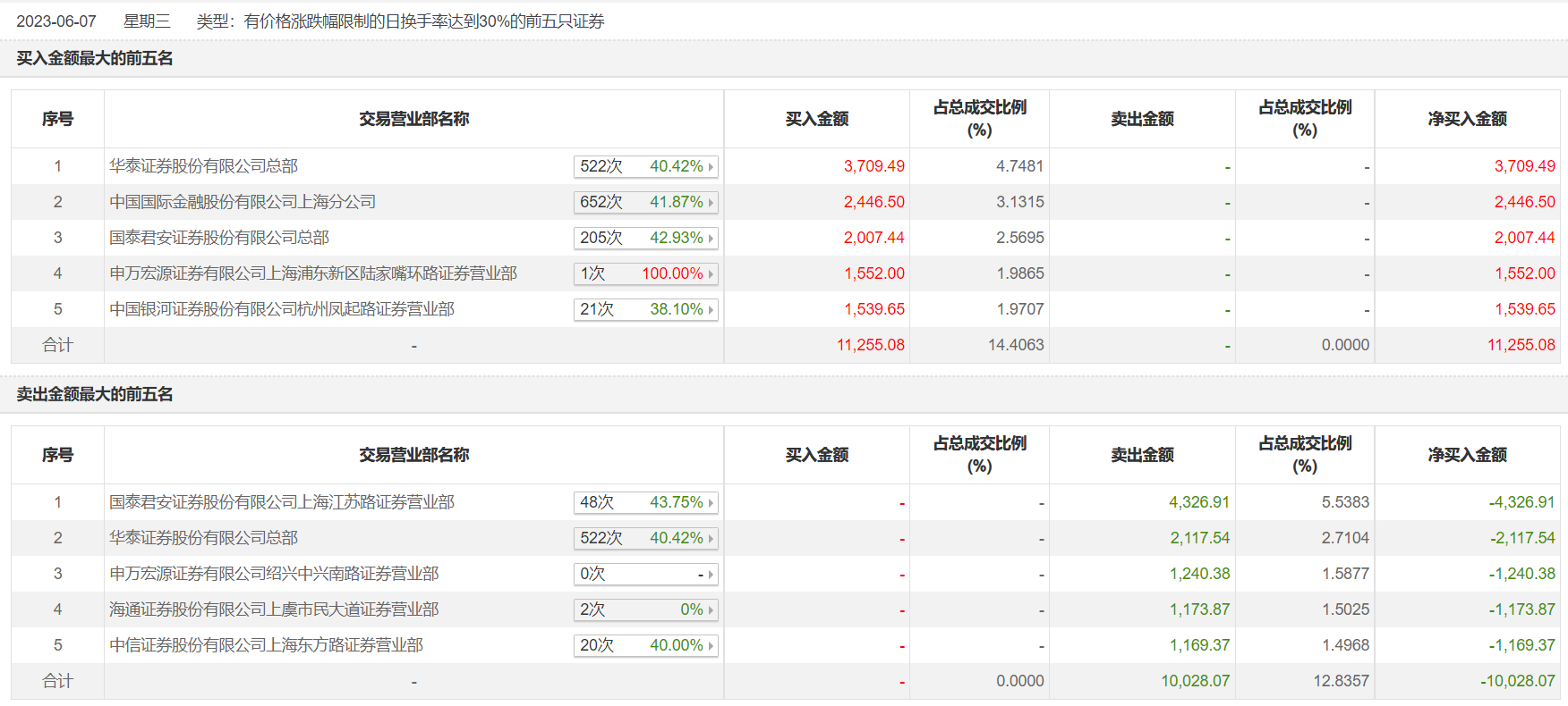 具体来看,知名游资现身龙虎榜,华泰证券总部、中国国际金融上海分公司分别买入3709.49万元、2446.50万元;章盟主(国泰君安证券上海江苏路证券营业部)、华泰证券总部分别卖出4326.91万元、2117.54万元。