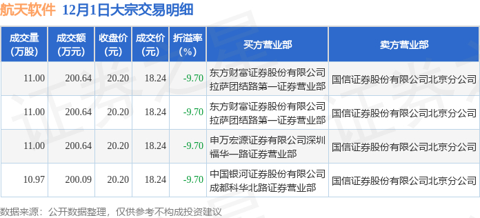 12月1日航天软件现802.01万元大宗交易