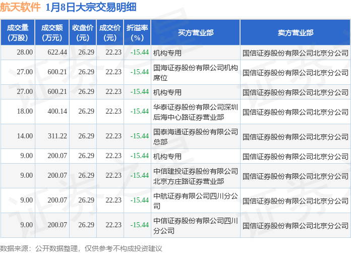 1月8日航天软件现9笔折价15.44%的大宗交易 合计成交3334.5万元