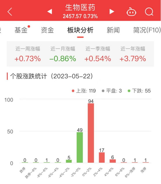 中国经济网北京5月22日讯今日,生物医药板块整体涨幅0.73%,其中119只股票上涨,3只股票平盘,55只股票下跌。