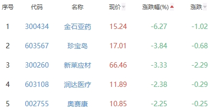 金石亚药、珍宝岛、新莱应材、润达医疗、奥赛康位列涨幅榜后五位,涨幅分别为-6.27%、-3.84%、-3.33%、-2.38%、-2.25%。