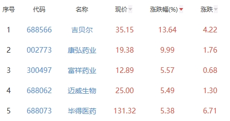 其中,吉贝尔、康弘药业、富祥药业、迈威生物、毕得医药位列板块涨幅前五位,涨幅分别为13.64%、9.99%、5.57%、5.49%、5.38%。