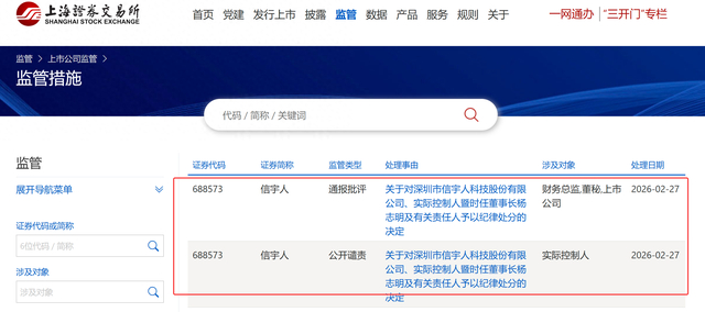 《科创板日报》2月27日讯(记者 黄修眉)上交所官网今日(2月27日)发布了对信宇人的两则纪律处分决定。信宇人亦于2月26日晚间发布相关公告。