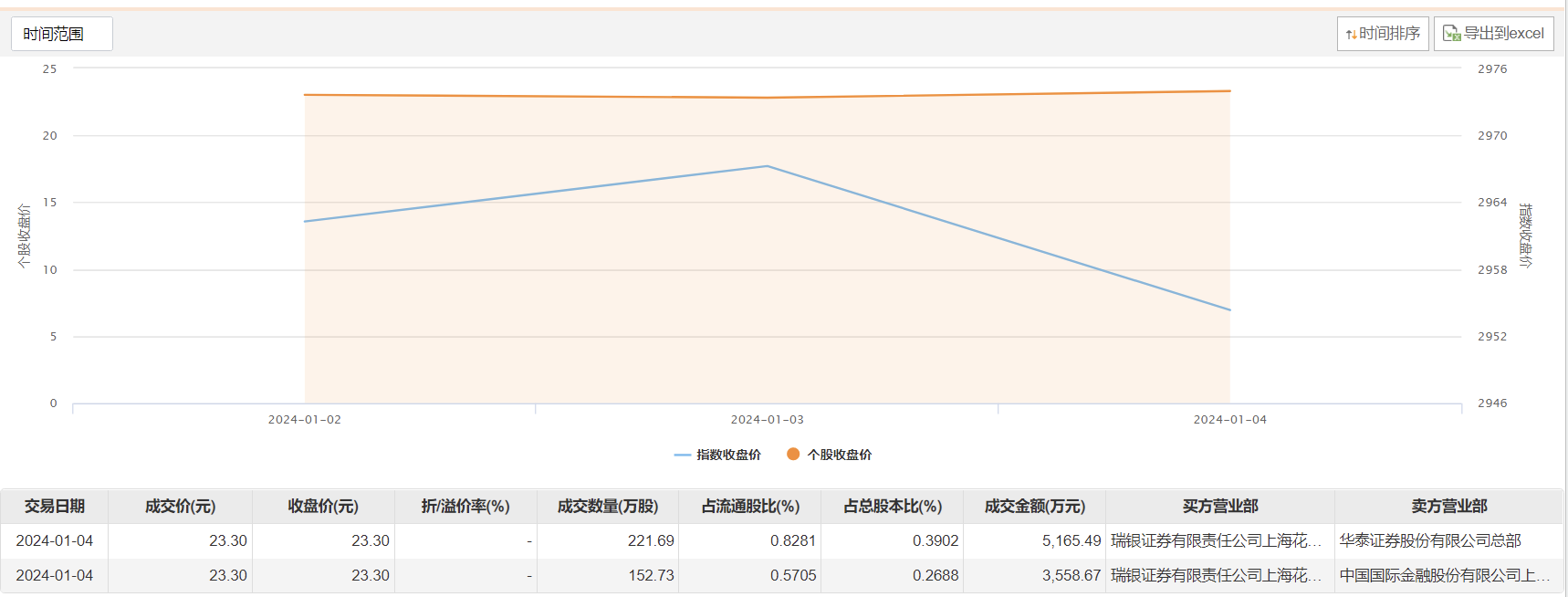 今日大宗交易成交374.42万股,成交额8724.16万元,占当日总成交额的52.02%,成交价23.3元,较市场收盘价持平。