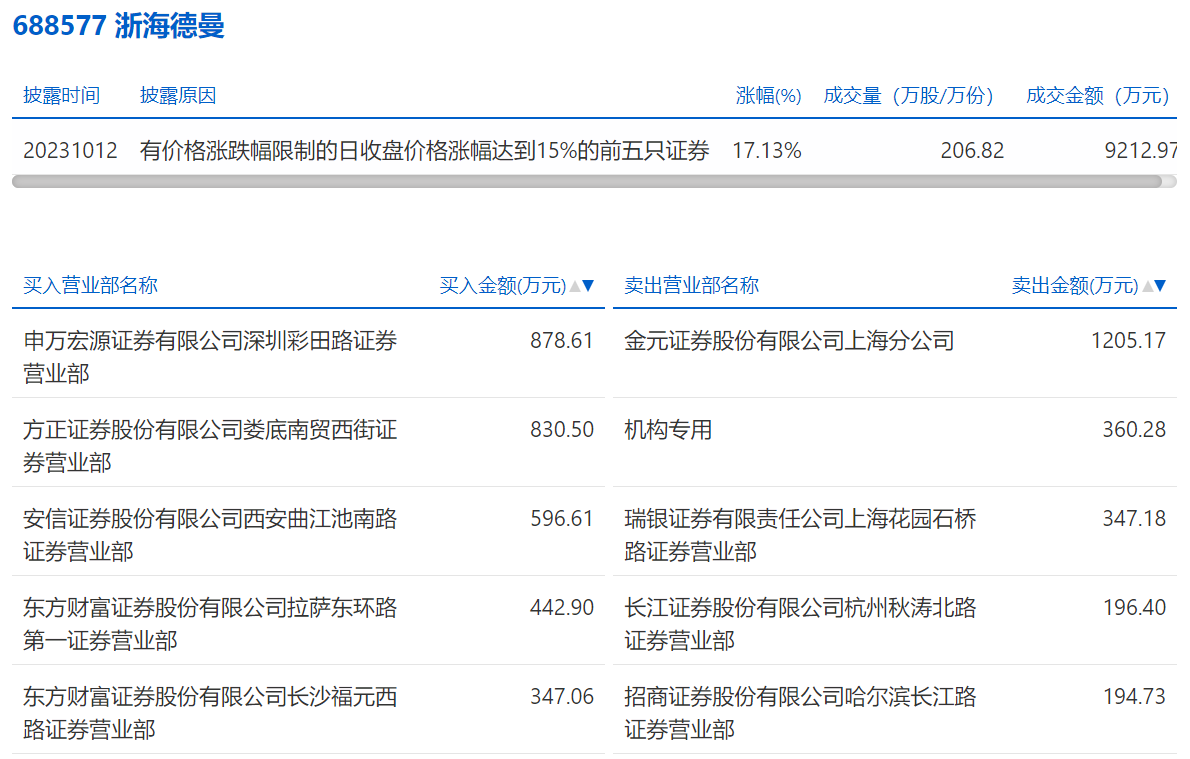 浙海德曼10月12日涨17.13%,全天换手率达3.82%,振幅达19.17%。龙虎榜数据显示,营业部席位合计净买入791.93万元。其中,机构合计净卖出360.28万元。此外,申万宏源证券有限公司深圳彩田路证券营业部、方正证券娄底南贸西街证券营业部分别买入878.61万元、830.50万元;金元证券上海分公司、瑞银证券上海花园石桥路证券营业部分别卖出1205.17万元、347.18万元。