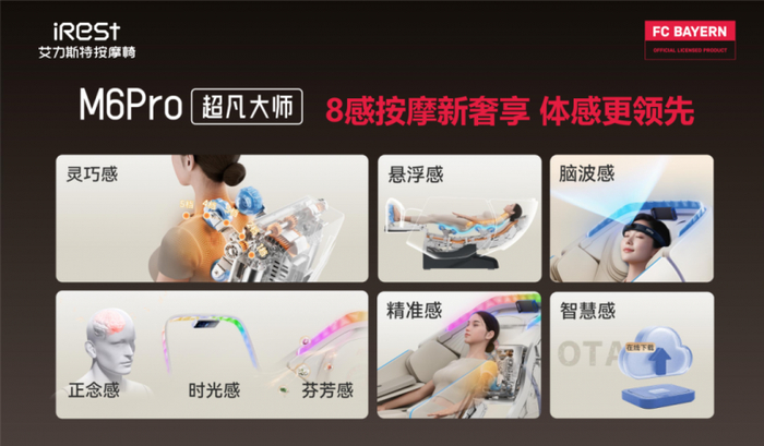 在本次活动中,iRest艾力斯特与拜仁慕尼黑合作的官方授权新款按摩椅超凡大师M6Pro、暖岛时光按摩沙发E55正式发布,引发了现场球迷们广泛关注。除此之外,此前发布的复芯号V8也备受关注。这三款按摩产品将iRest艾力斯特在健康按摩领域的深厚技术积淀,与拜仁慕尼黑百年足球俱乐部的品牌精神完美融合。