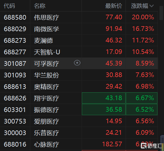 格隆汇4月26日丨伟思医疗20cm涨停,南微医学、麦澜德、天智航涨超10%,可孚医疗、翔宇医疗、爱朋医疗、振德医疗等十余股涨超6%。