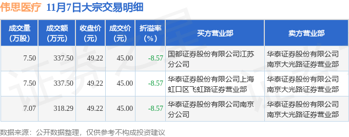 11月7日伟思医疗发生3笔大宗交易 成交金额993.29万元