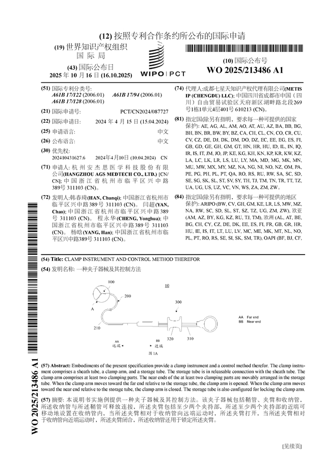 安杰思公布国际专利申请:“一种夹子器械及其控制方法”