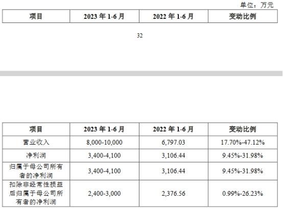 公司2023年上半年营业收入约为8,000万元至10,000万元,同比增长17.70%至47.12%;2023年上半年净利润约为3,400万元至4,100万元,同比增长9.45%至31.98%;2023年上半年扣除非经常性损益后归属于母公司股东的净利润为2,400万元至3,000万元,同比增长0.99%至26.23%。