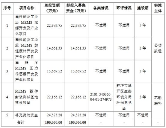 公司于2023年6月27日发布的招股说明书显示,公司拟募集资金100,000.00万元,分别用于高性能及工业级MEMS陀螺开发及产业化项目、高性能及工业级MEMS加速度计开发及产业化项目、高精度MEMS压力传感器开发及产业化项目、MEMS器件封装测试基地建设项目、补充流动资金。