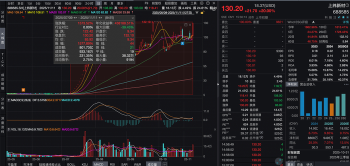 消息释出后,上纬新材即收获20%涨停,报130.20元/股。而自搭上智元机器人的快车,4个月时间上纬新材股价已经涨超1500%。