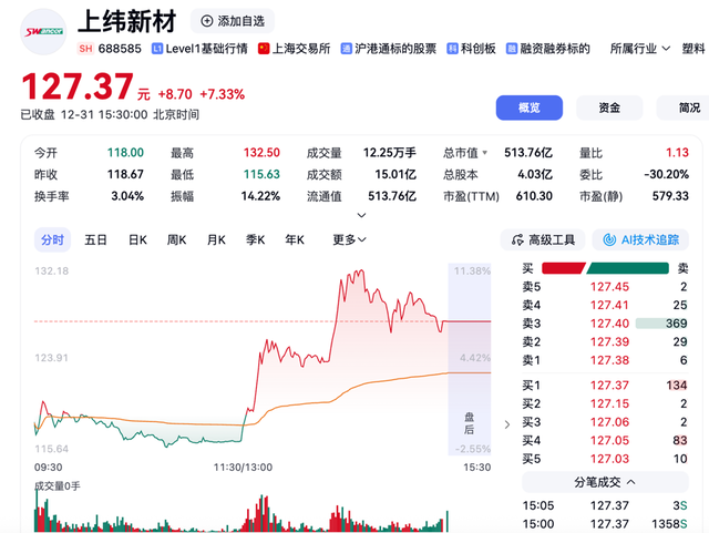 在2025年的最后一个交易日,上纬新材股价收报127.37元/股,单日涨幅7.33%,总市值突破500亿元大关。