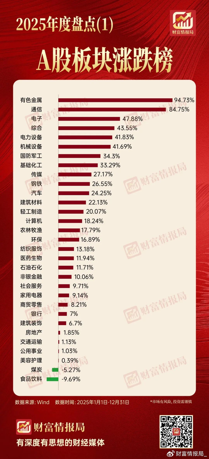 从行业板块表现来看,由于新能源渗透、AI算力扩张以及国产替代等三重产业趋势共振驱动,叠加宏观层面的流动性宽松与政策支持,在申万一级行业中,有色金属、通信、电子行业领涨A股市场,这三大行业板块2025年分别累计上涨92.73%、84.75%、47.88%。
