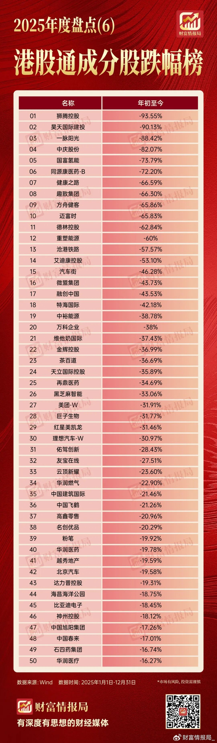 与此同时,在565只港股通成分股(需在2025年1月1日前上市)中,有127只股票录得年度负收益,占比22%。其中,有一定市值规模且为内地投资者所熟知的企业,如万科企业、茶百道、美团、理想汽车则分别下跌38%、36.69%、31.91%和30.97%,成为港股投资者2025年的意难平之一。