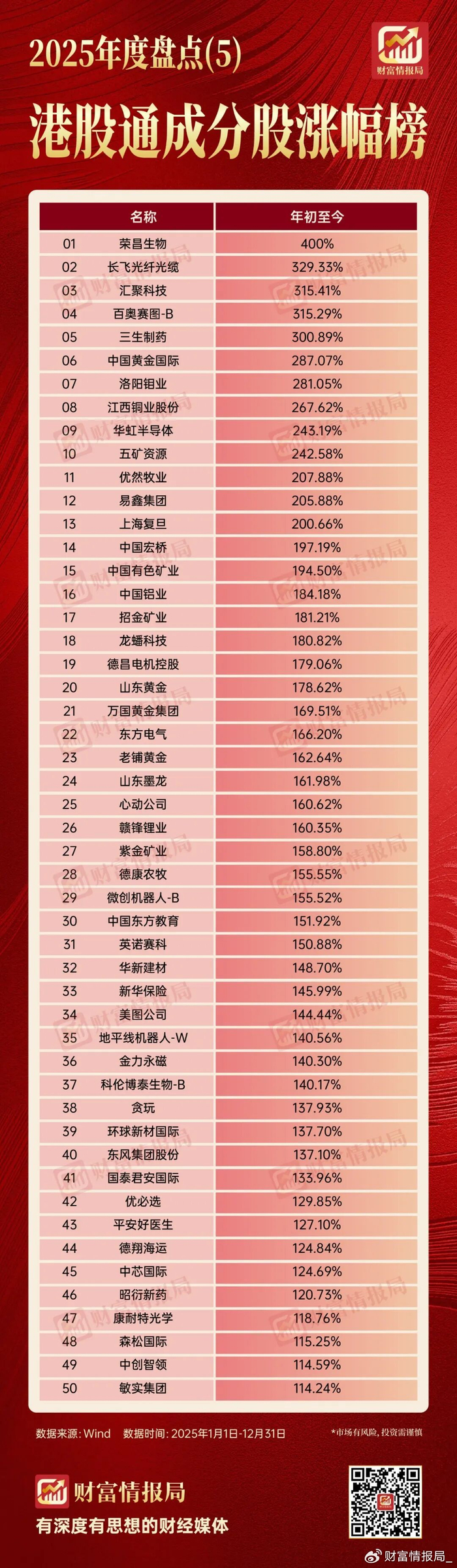 从个股表现来看,我们主要对港股通成分股的年度(2025.1.1-12.31)涨跌幅进行了筛选梳理。