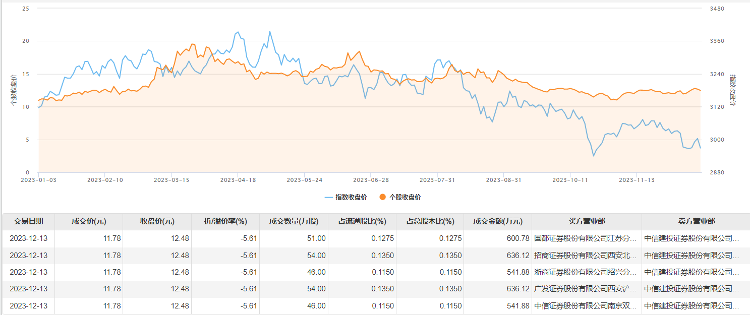 12月13日大宗交易成交251万股,成交额2956.78万元,占当日总成交额的36.57%,成交价11.78元,较市场收盘价折价5.61%。