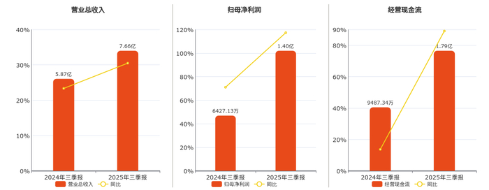 公司营业总收入为7.66亿元。归母净利润为1.40亿元。经营活动现金净流入为1.79亿元。