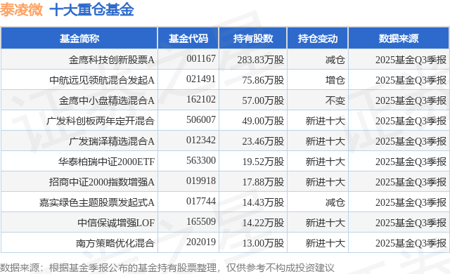 根据2025基金Q3季报公募基金重仓股数据,重仓该股的公募基金共21家,其中持有数量最多的公募基金为金鹰基金的金鹰科技创新股票A。金鹰科技创新股票A目前规模为40.67亿元,最新净值1.9009(11月13日),较上一交易日上涨0.84%,近一年上涨27.44%。该公募基金现任基金经理为陈颖。陈颖在任的基金产品包括:金鹰核心资源混合A,管理时间为2019年1月26日至今,期间收益率为240.9%;金鹰红利价值混合A,管理时间为2020年4月28日至今,期间收益率为168.47%;金鹰科技致远混合A,管理时间为2024年3月19日至今,期间收益率为78.76%。