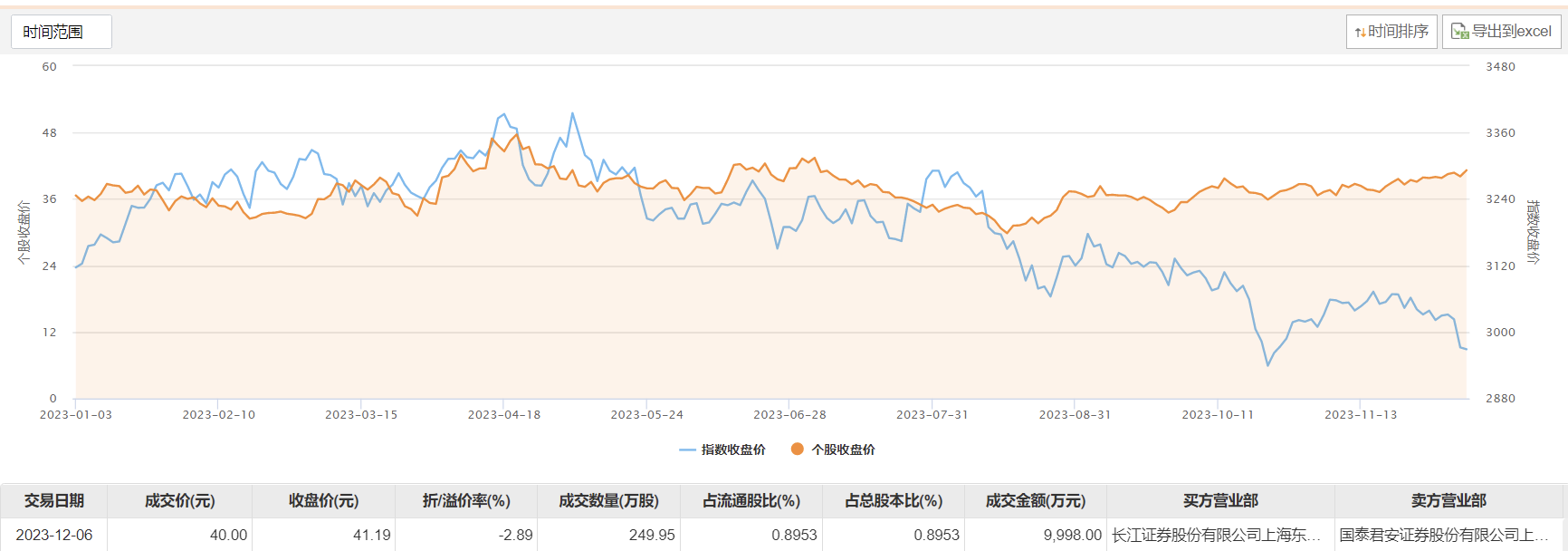 今日大宗交易成交249.95万股,成交额9998万元,占当日总成交额的47.55%,成交价40元,较市场收盘价折价2.89%。