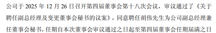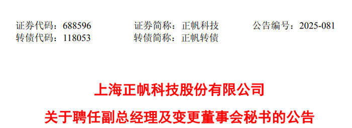 经正帆科技董事长提名、董事会提名委员会审查,正帆科技第四届董事会第十八次会议于2025年12月26日审议通过《关于聘任副总经理及变更董事会秘书的议案》。会议同意聘任胡伟为公司副总经理兼任董事会秘书,任期自本次董事会审议通过之日起至第四届董事会任期届满之日止。