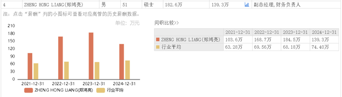 据东方财富网数据,郑鸿亮2024年所获薪酬为139.3万元,相较上年薪酬184.5万元降薪24.49%。