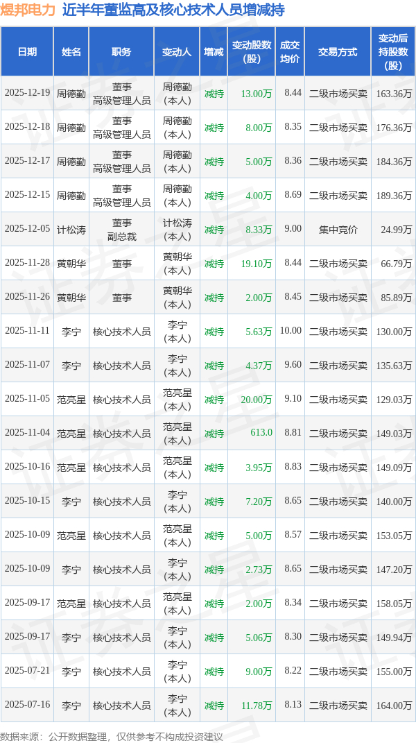 煜邦电力近半年内的董监高及核心技术人员增减持详情如下: