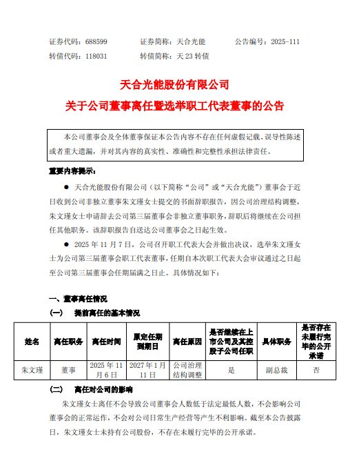 11月7日,天合光能(688599)发生高管职务变动。
